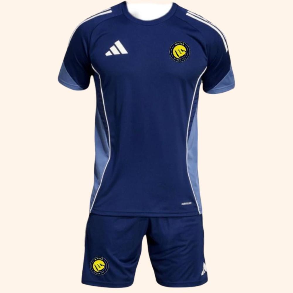 تيشيرت كحلي بخطوط كتف بيضاء، وشورت رياضي بنفس اللون، شعار النصر الجديد مطرز بدقة على الصدر والساق، مع شعار Adidas الرسمي.
