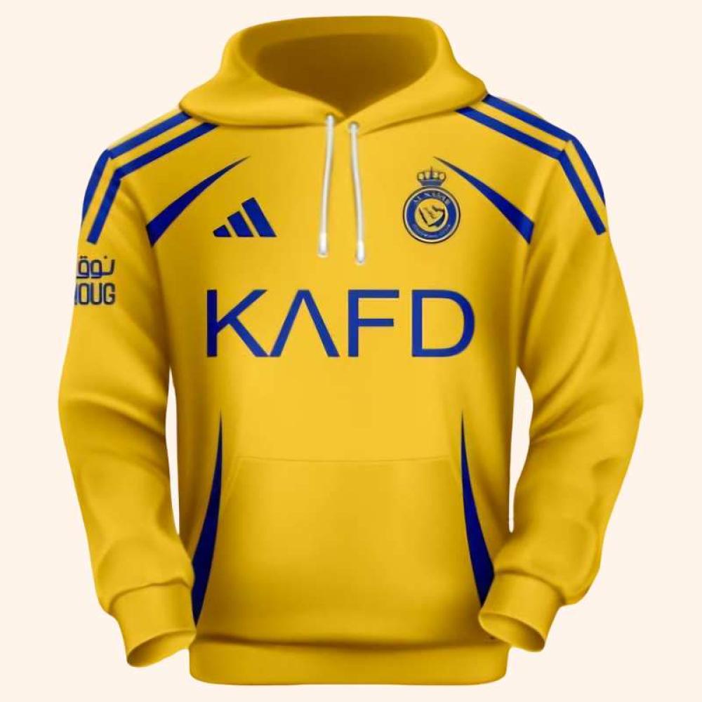 شعار نادي النصر مطرز على الصدر، شعار Adidas، شعار KAFD في المنتصف، شعارات NOUG وكتابة عربية على الأكمام.