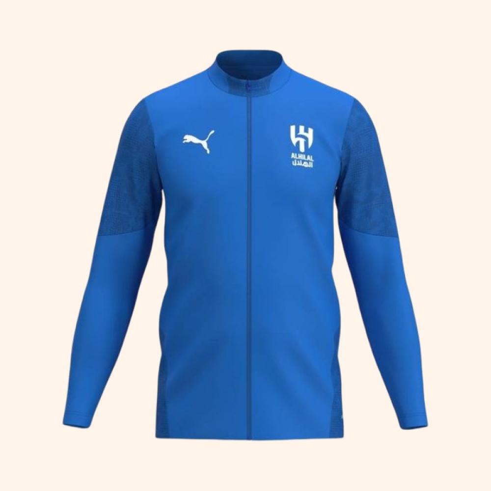 جاكت أزرق بتصميم فاخر ومميز بشعار نادي الهلال السعودي على الصدر تعزز طابع التشجيع والانتماء.