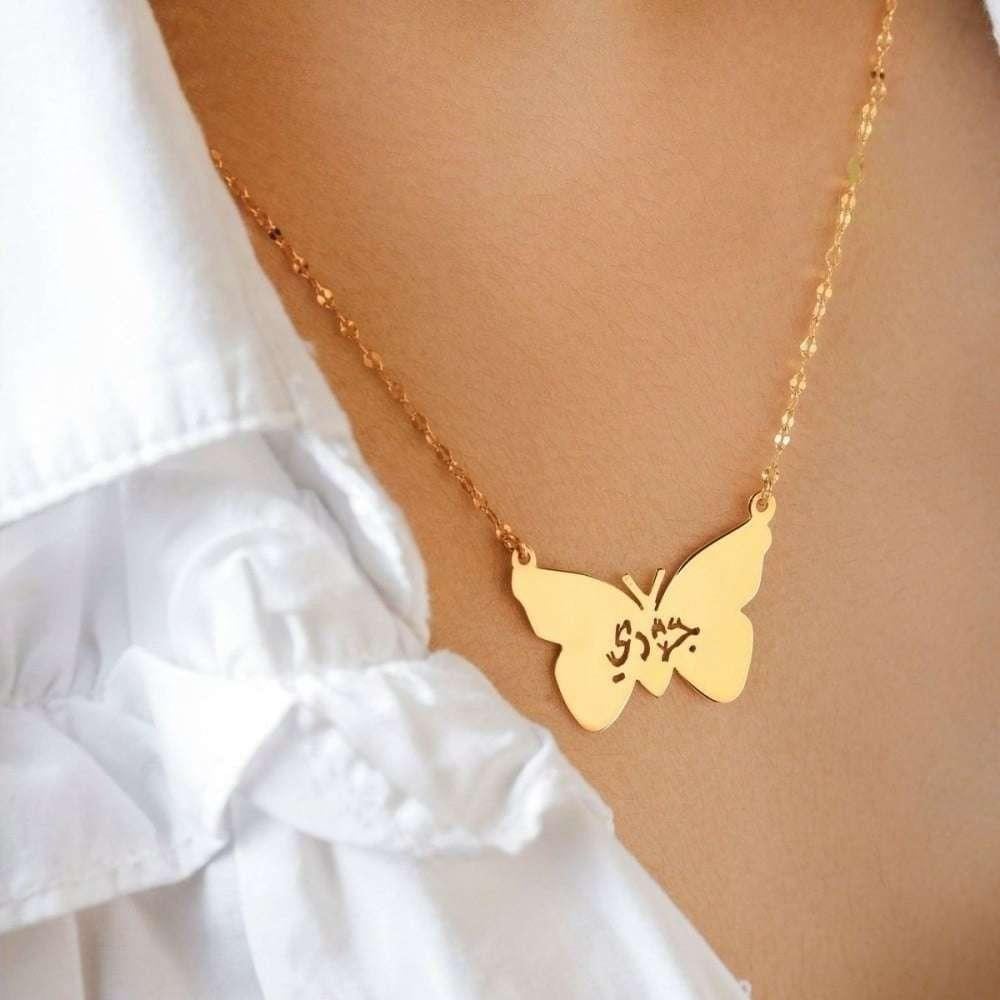 سلسال الفراشه بالاسم حسب الطلبالعقد من تصميم وتنفيذ متجر مودلنصنعه بإحتراف يدويًا وبشكل خاص لكل عميل ..كما يمكنك اختيار صياغة اللون ذهبي - فضي ..كتابة الاسم حسب الطلبتصميم الشكل حسب الطلب