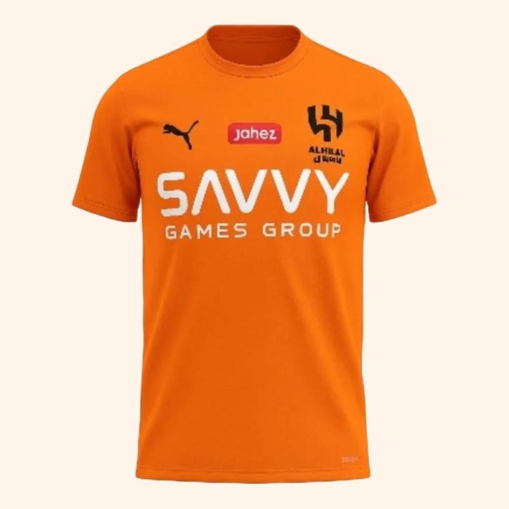 تيشيرت بونو البرتقالي بشعار نادي الهلال مستوحى من إطلالة النجم الكبير في المباريات الحاسمة. لون جريء، تصميم رياضي، وانتماء ما يحتاج توضيح.