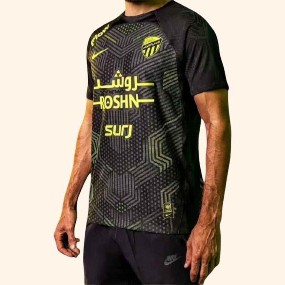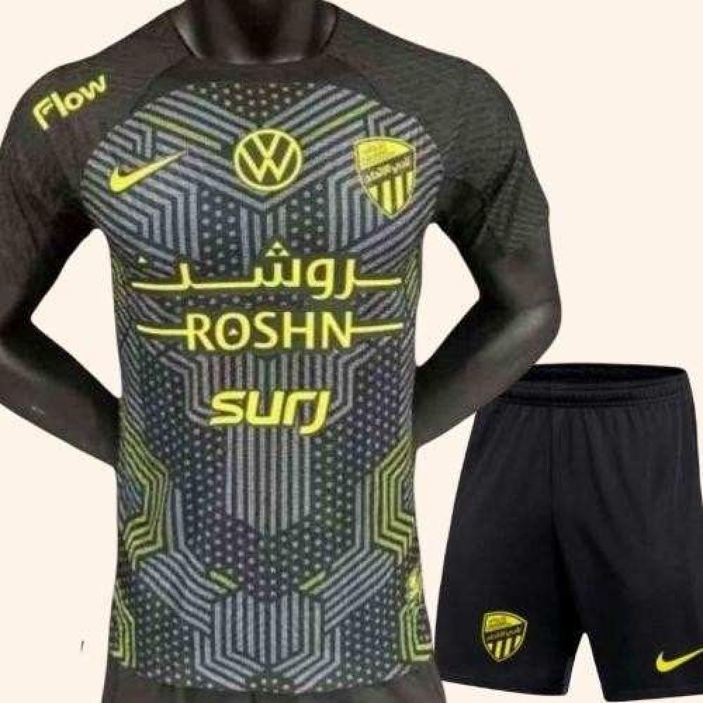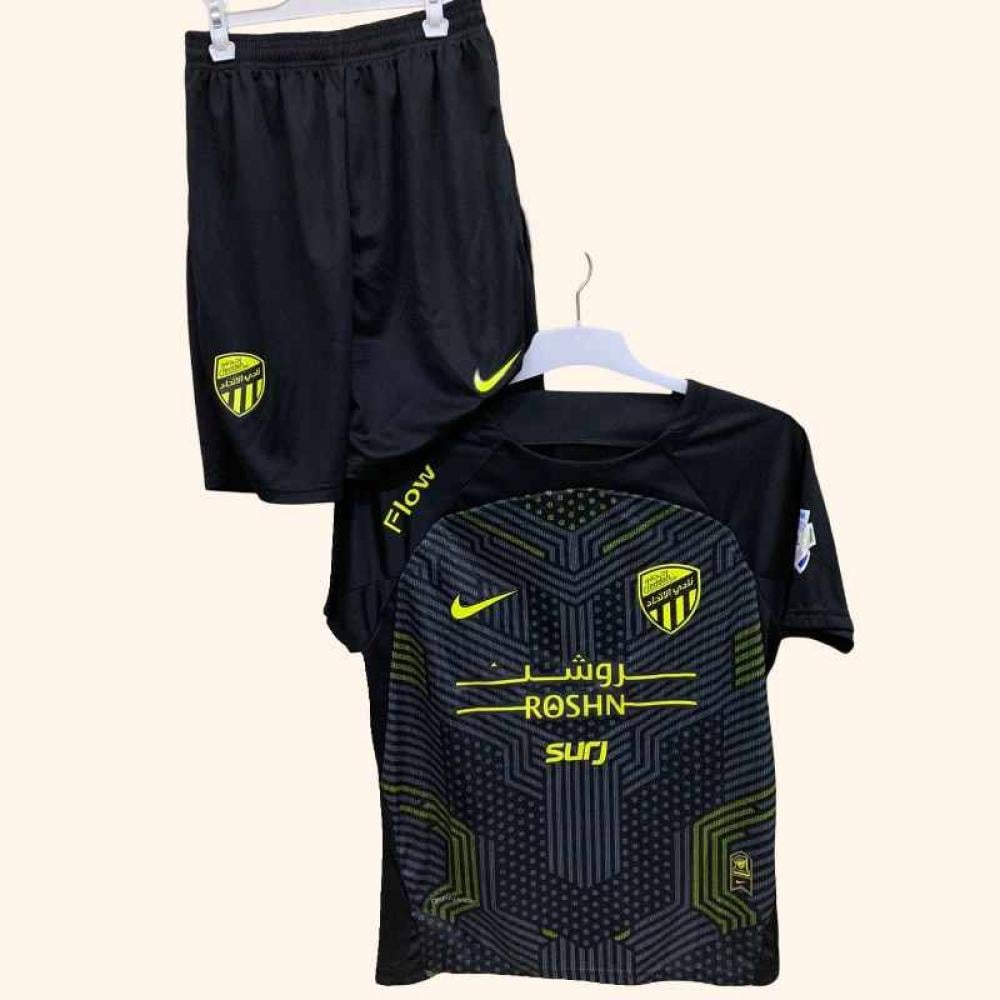 الطقم يشمل تيشيرت أسود بنقوش هندسية ولمسات ذهبية فاخرة، وشورت رياضي متناسق بنفس الطابع، بخامة بوليستر أصلية درجة أولى، نفس نسخة اللاعبين المعتمدة.