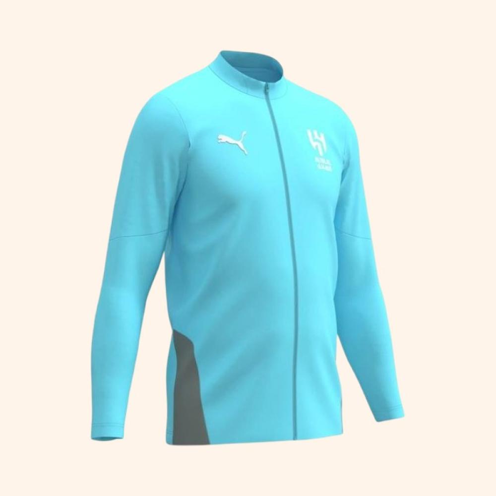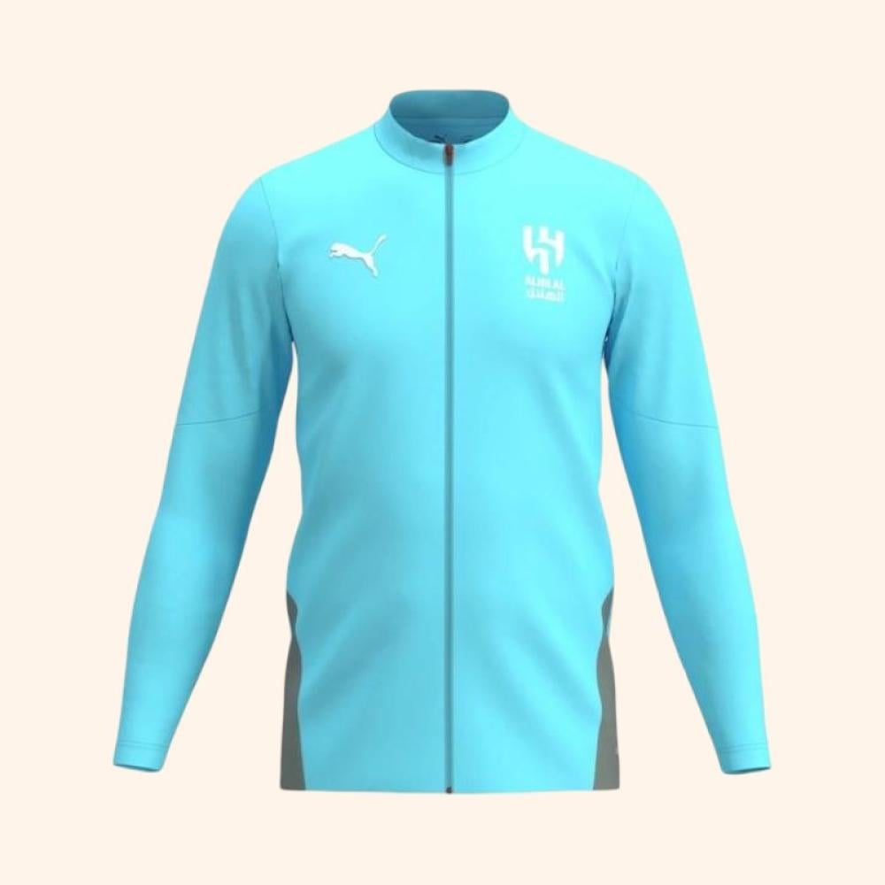 خلك دافئ وأنيق مع جاكت تمارين شتوي بلون سماوي ملكي، يحمل شعار نادي الهلال السعودي على الصدر بتفاصيل راقية تليق بالمشجع الواثق من نفسه.
