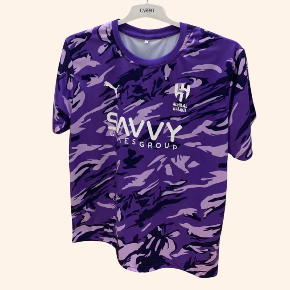 اللون البنفسجي الجريء يعطي حضور قوي، مع شعار الهلال مطبوع بجودة عالية على التيشيرت